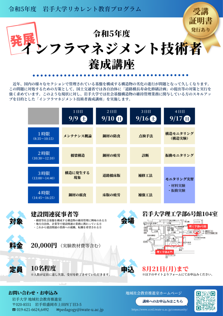 このような現状に対し、岩手大学では社会基盤構造物の維持管理業務に関与している方のスキルアップを目