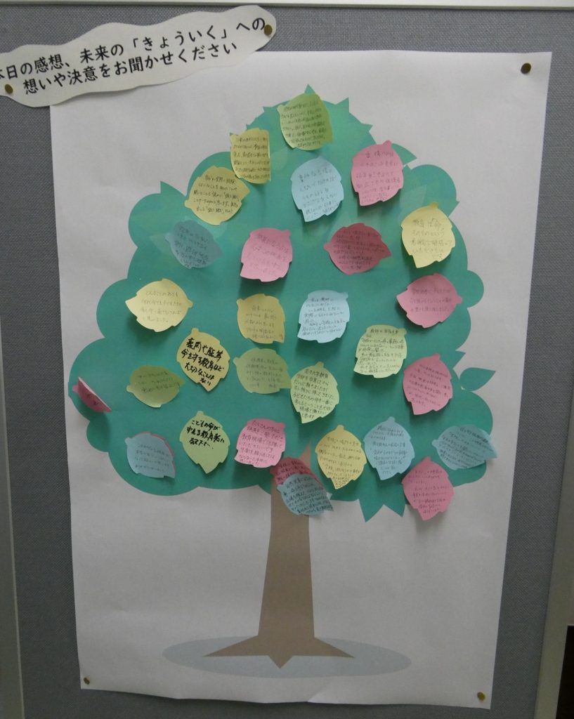 また、映画視聴の感想や未来の「きょういく」の実現にむけての決意、想いを葉の形の付箋に書いて木のイラストに貼ってもらい、『きょういくのツリー』(添付写真参照)を作成しました。上映会終了後は、教育学部1号館内掲示板での掲示を行い、参加できなかった学生や教職員に「きょういく」に対する希望のあるメッセージに触れてもらうことで、教職に対するイメージのポジティブな強化・転換を図れるよう試みました。